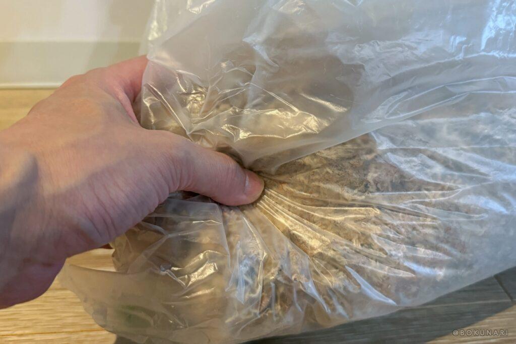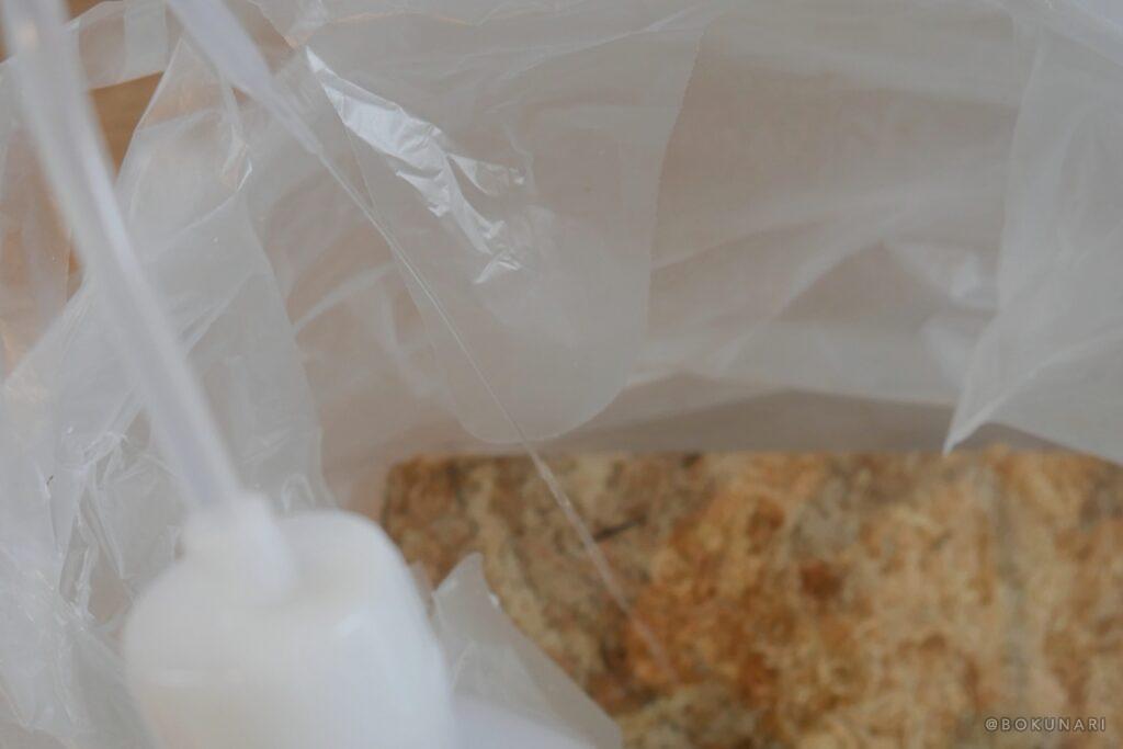 半日程度経ったら、袋ごと両手に持って水分が満遍なくいきわたるように軽く振ります。