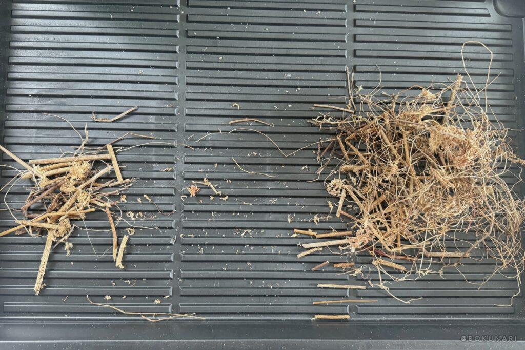 作業をしやすくするためにあとひと手間。混入している枝葉などのゴミを手やピンセットで取り除いておくと板付け作業がしやすいです。