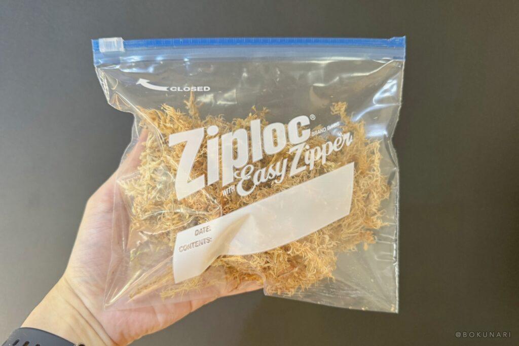 一旦、水で戻して余った水苔はそのまま袋を密閉しておくか、ジップロックのような食品保存袋に入れて密閉し、暗所で保存できます。
