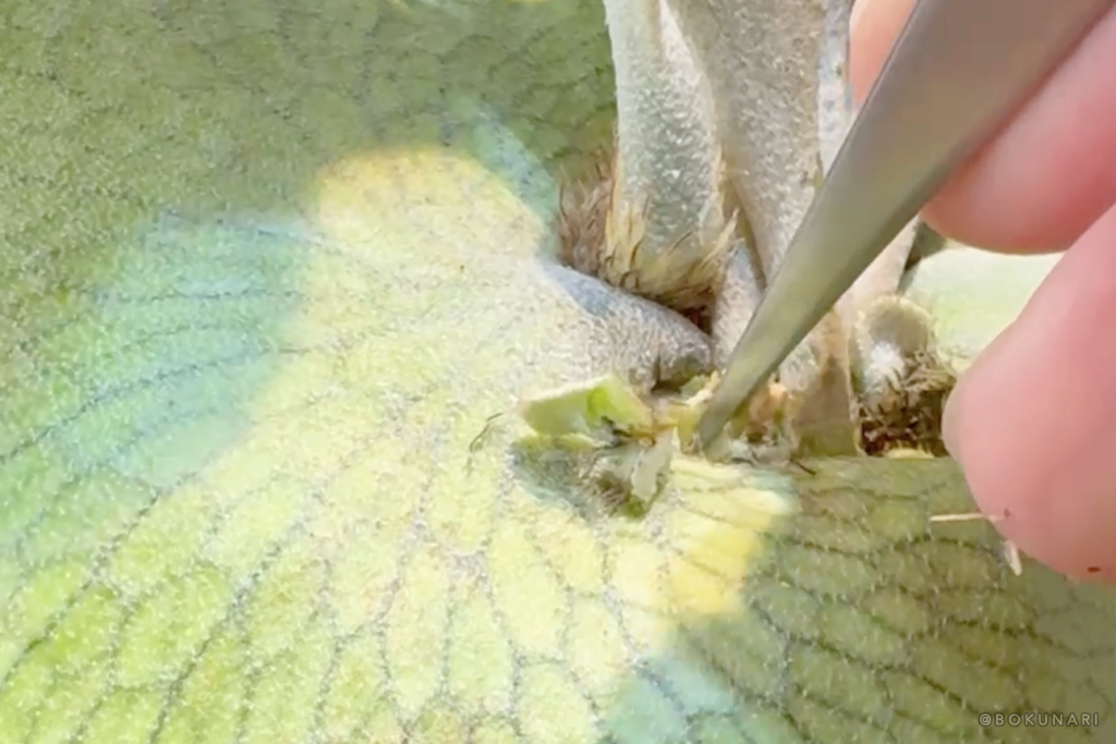 親株の成長点付近に「脇芽」を発見したら、早い段階で指先やピンセットを使って脇芽の成長点を潰すようにします。