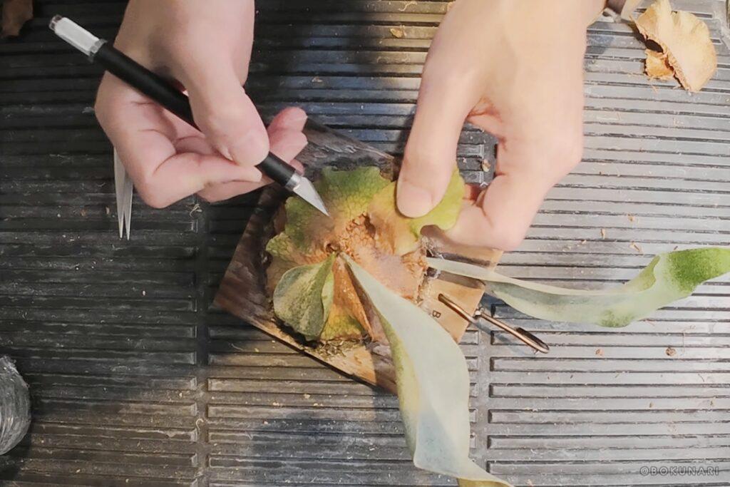 成長点が露出できたら、成長点周りに残った貯水葉の細かな部分はピンセットで取り除きます。成長点を傷つけないように注意して作業してください。