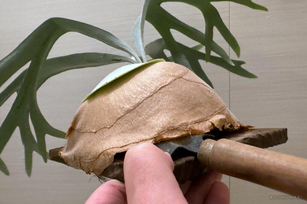 深夜のビカクシダ仕立て直し(板替)の儀。白ビフを板替。